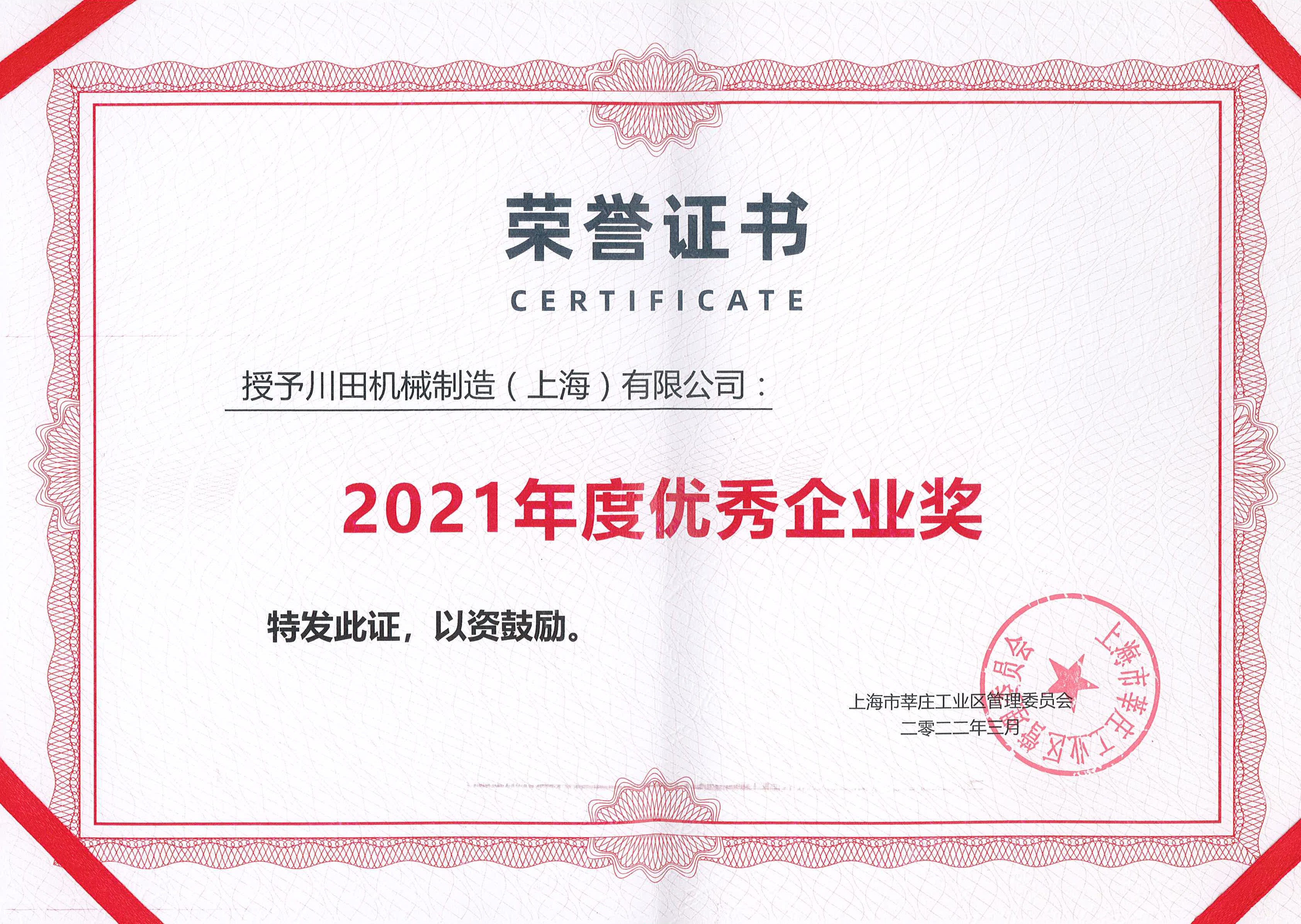 2021 莘莊工業(yè)區(qū) 優(yōu)秀企業(yè)獎證書