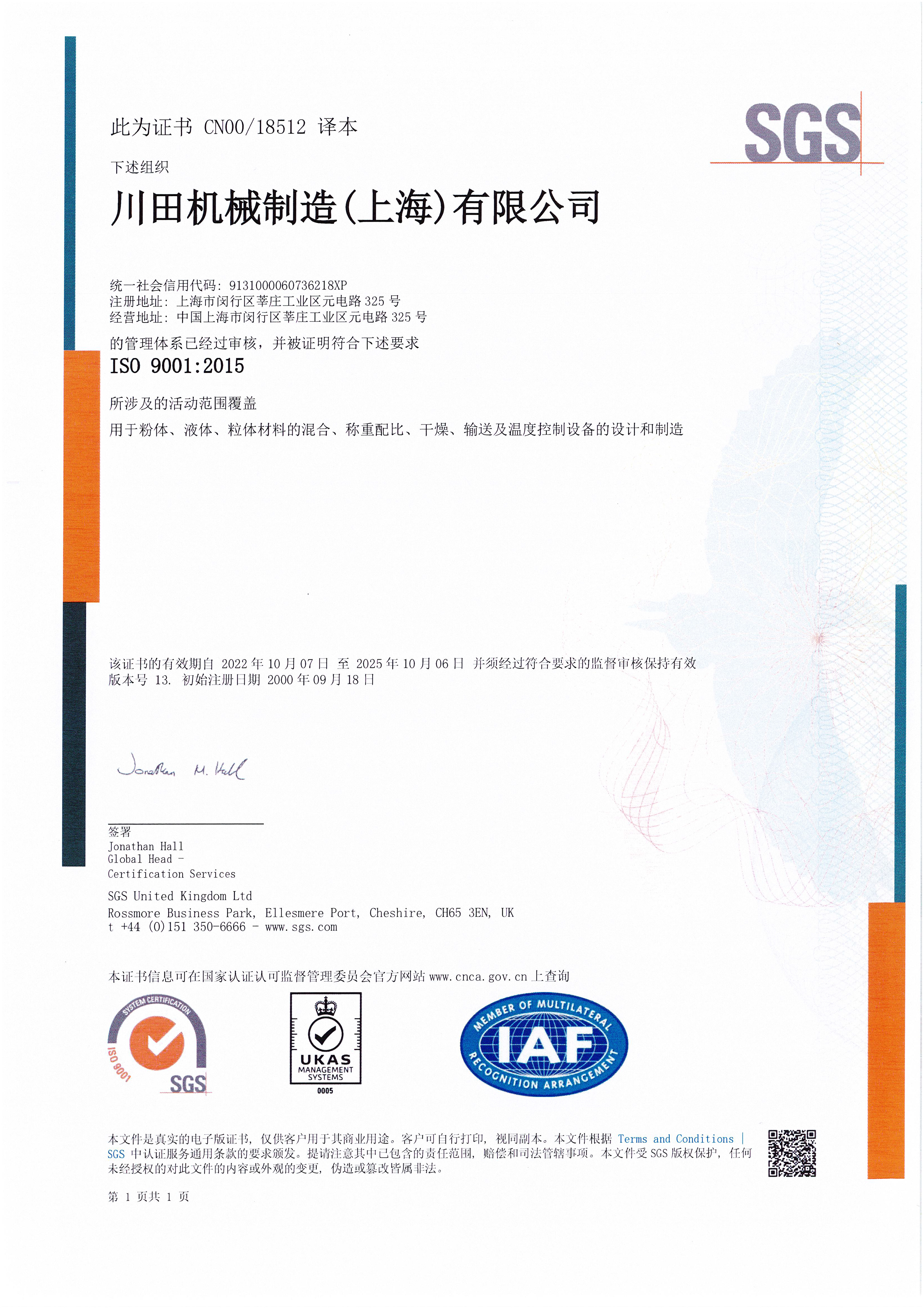 ISO9001証書(2022.10.7-2025.10.6)