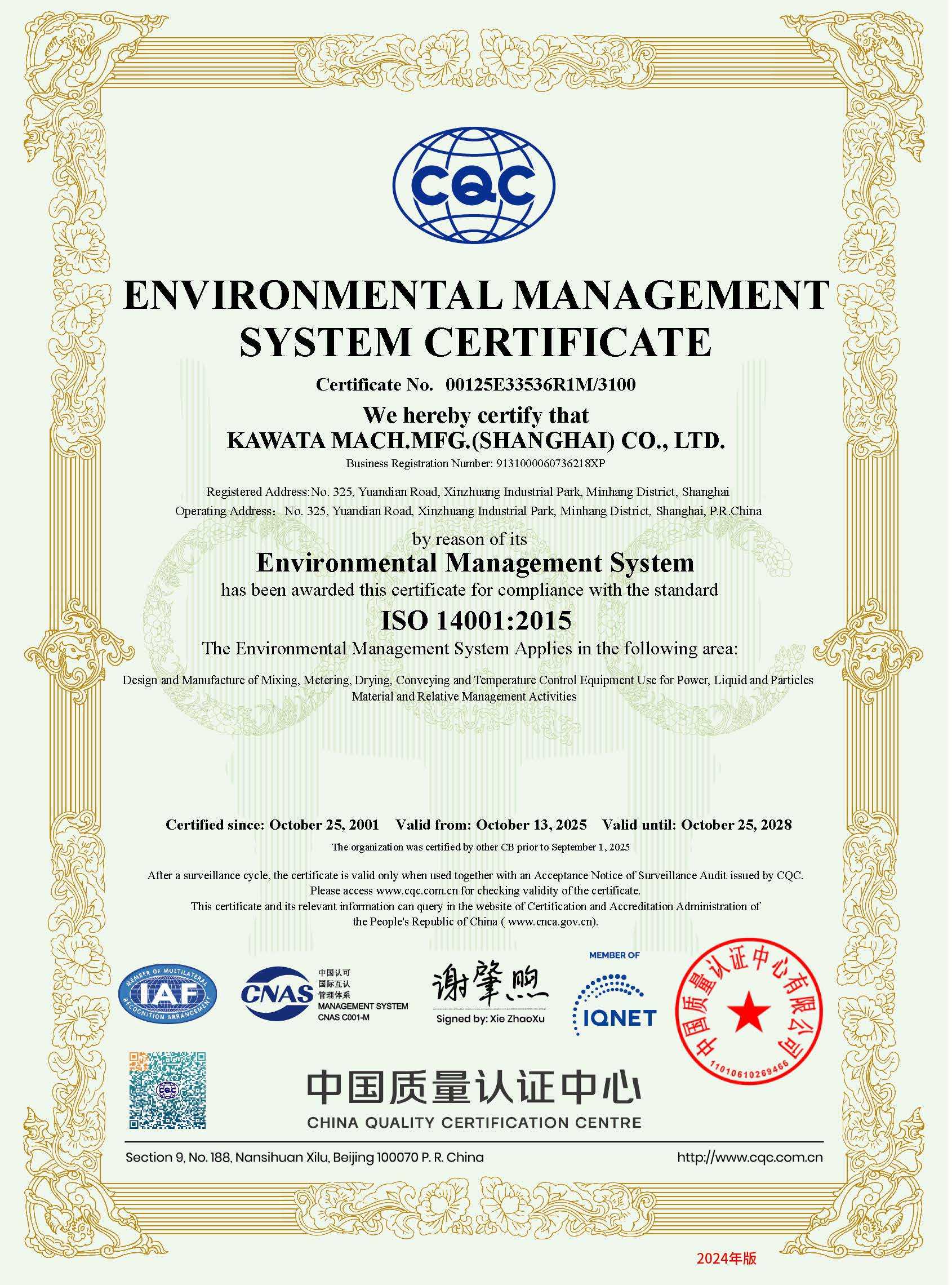 ISO14001 品質(zhì)管理システム証書(2025.9.26-2028.10.6)