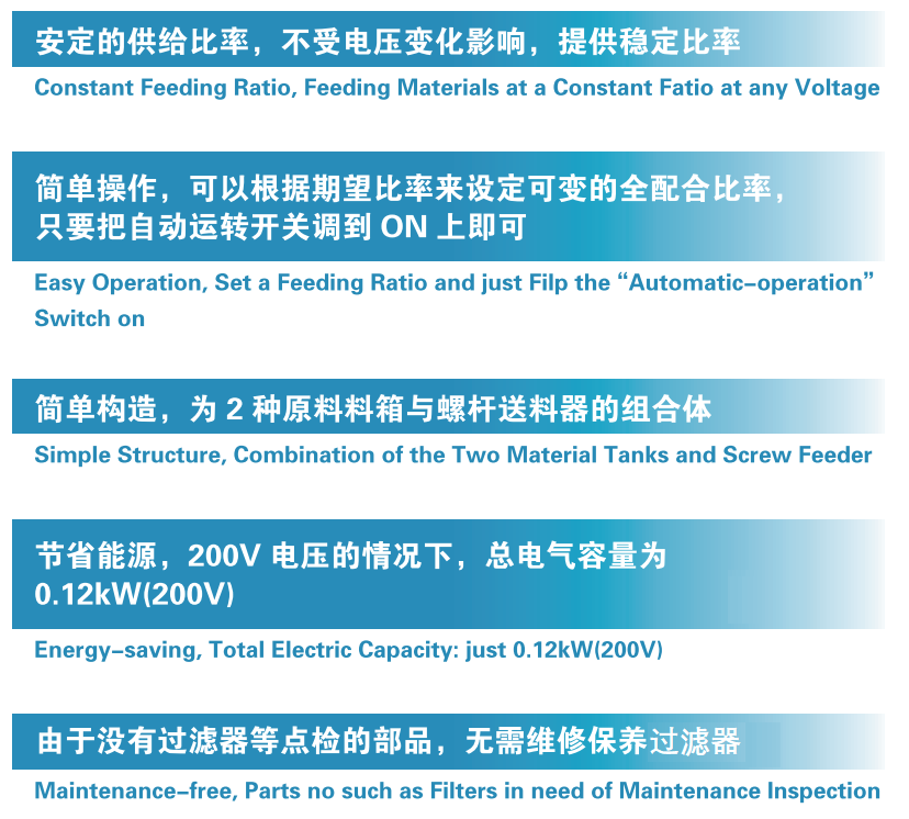 經濟型容量計量機川田的混合料箱能以給2種材料(主材與粉碎材)提供各種各樣的安定混合比率,是經濟型的機種